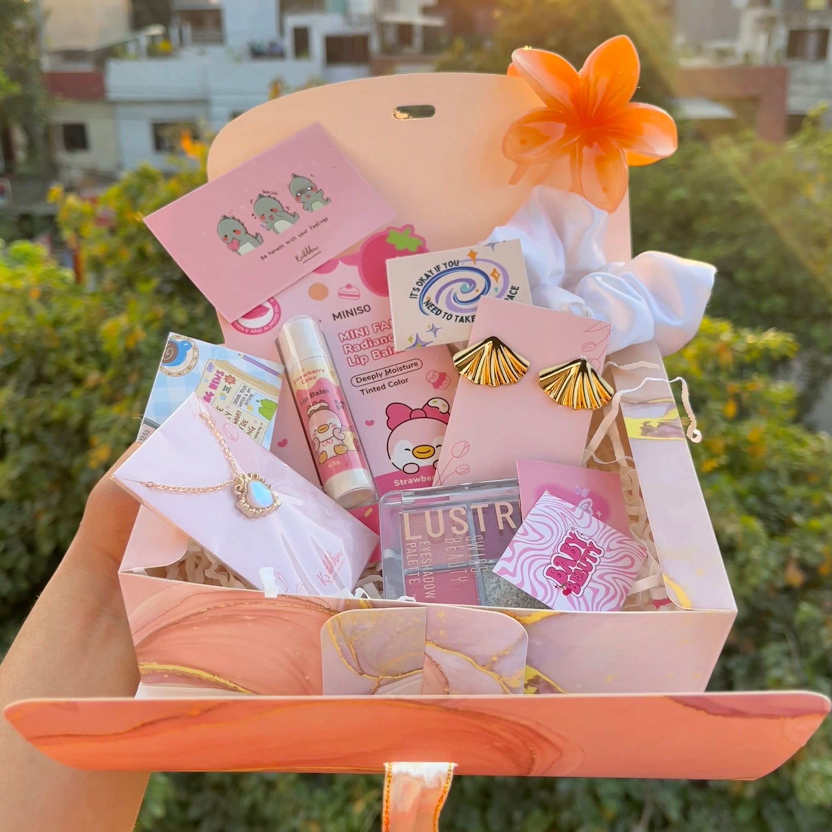 - Includes - Orange Claw Clip, White Satin Scrunchie, Miniso Lip Balm, Anti-Tarnish Earrings(can be any design), Swiss Beauty Eyeshadow Pallette and Golden Heart Pendant