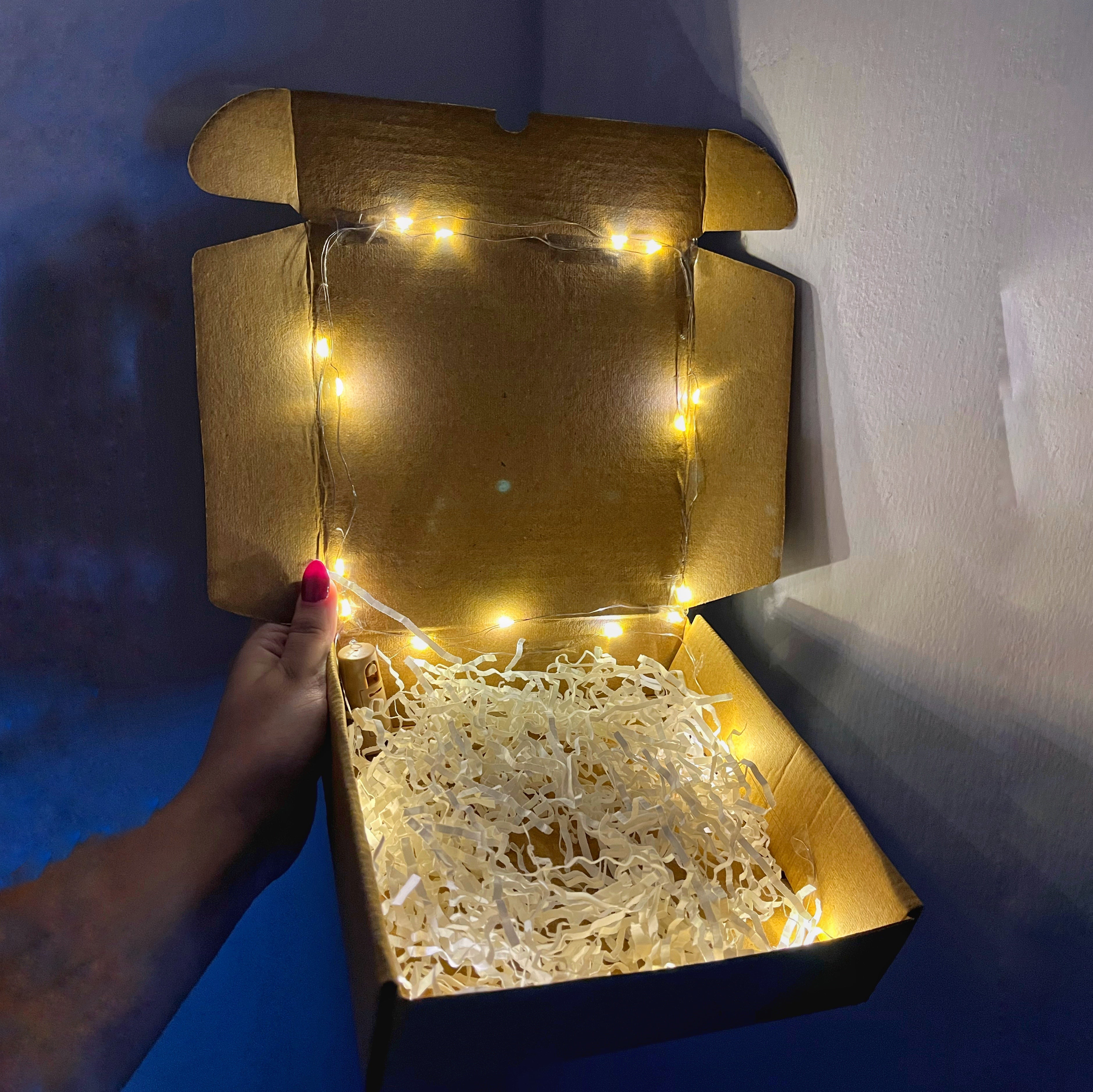 - Comes with a 7X7X2 inch box with fairy lights & banner ( if chosen)