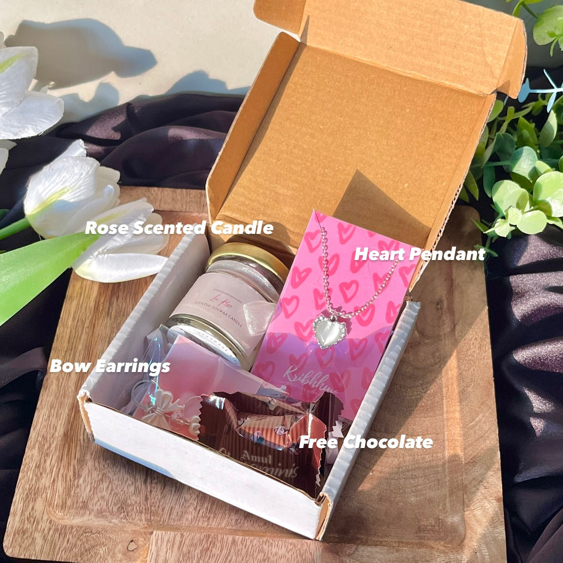 - Includes - Silver Heart Pendant, Bow Earrings, Rose Scented Jar Candle w Hearts and Free Chocolate